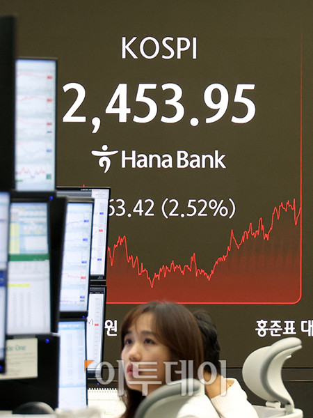 도널드 트럼프 미국 대통령의 관세 부과 여파로 3일 서울 중구 하나은행 딜링룸 전광판에 코스피 지수가 전 거래일보다 63.42포인트(2.52%) 내린 2453.95를 나타내고 있다. 코스닥 지수는 전 거래일보다 24.49포인트(3.36%) 하락한 703.80에 거래를 마쳤다. 원·달러 환율은 주간 거래 종가(15시30분) 기준 전일 대비 14.5원 오른 1467.2원을 기록했다. 고이란 기자 photoeran@