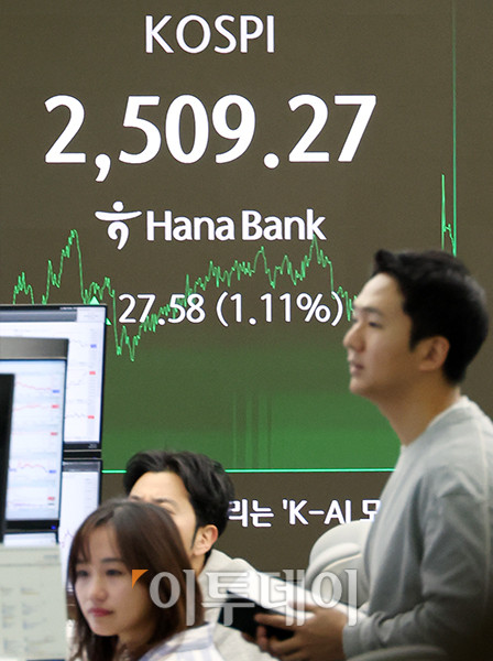 5일 서울 중구 하나은행 딜링룸 전광판에` 코스피 지수가 전 거래일보다 27.58포인트(1.11%) 오른 2509.27을 나타내고 있다. 코스닥 지수는 전 거래일보다 11.06포인트(1.54%) 상승한 730.98에 거래를 마쳤다. 원·달러 환율은 주간 거래 종가(15시30분) 기준 전일 대비 18.6원 오른 1444.3원을 기록했다. 고이란 기자 photoeran@