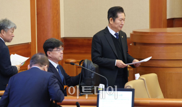 ▲정청래 국회 탄핵소추위원장이 6일 서울 종로구 헌법재판소 대심판정에서 열린 윤석열 대통령 탄핵 심판 6차 변론에 출석하고 있다. 사진공동취재단