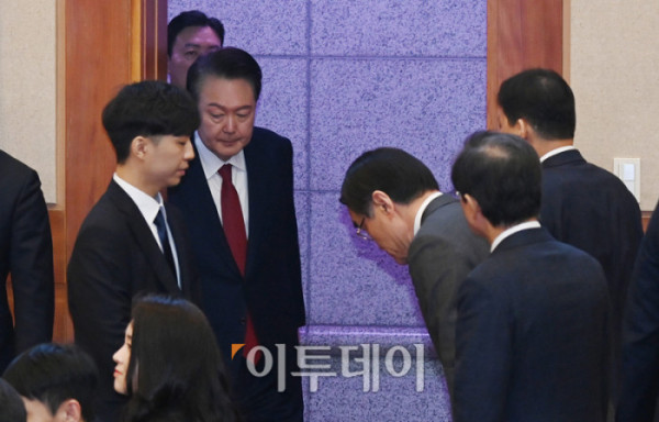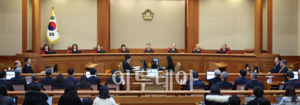 ▲윤석열 대통령이 6일 서울 종로구 헌법재판소 대심판정에서 열린 탄핵 심판 6차 변론에 출석해 문형배 헌법재판소장 직무대행을 비롯한 헌법재판관들의 입장을 지켜보고 있다. 사진공동취재단