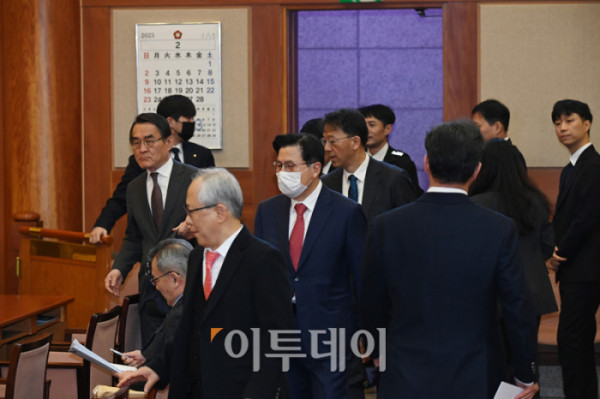 ▲황교안 전 국무총리가 6일 서울 종로구 헌법재판소 대심판정에서 열린 윤석열 대통령 탄핵심판 6차 변론기일에 참석하고 있다. 사진공동취재단