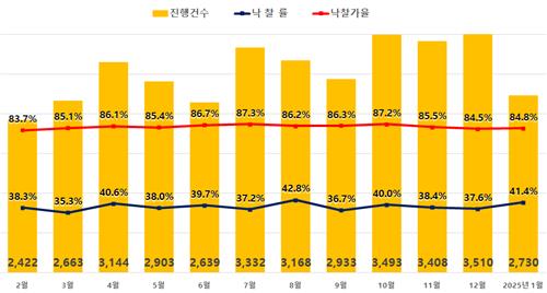 7일 경·공매 데이터 전문기업 지지옥션이 발표한 ‘2025년 1월 경매동향보고서’에 따르면 1월 전국 아파트 경매 진행건수는 2730건으로 전월(3510건) 대비 22% 감소했다. 낙찰률은 41.4%로 전달(37.6%) 보다 3.8%p 상승하며 3개월 만에 40%를 넘겼다.