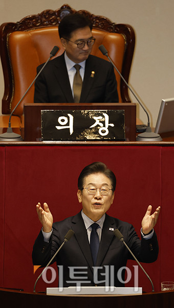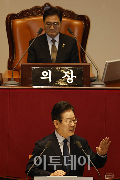이재명 더불어민주당 대표가 10일 서울 여의도 국회 본회의에서 교섭단체 대표 연설을 하고 있다. 이날 이 대표는 "경제를 살리는데 이념이 무슨 소용이고, 민생을 살리는데 색깔이 무슨 의미인가"라며 "진보 정책이든 보수 정책이든 유용한 처방이라면 총동원하자"고 강조했다. 고이란 기자 photoeran@