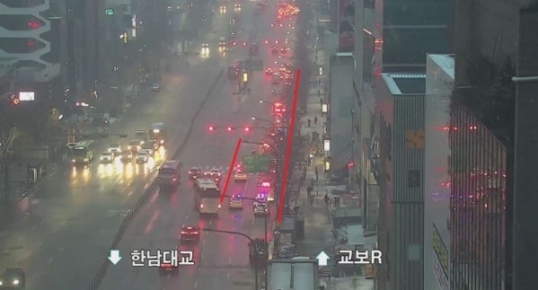 서울시 교통정보에 따르면 서울 서초구 강남대로 논현역에서 교보타워사거리까지 소방차 출동으로 부분 통제되고 있다.