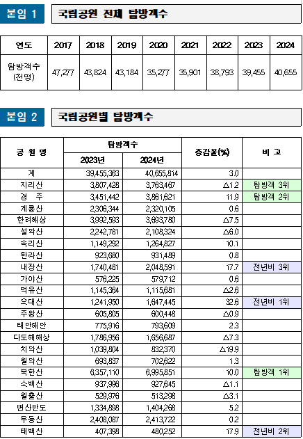 22개 국립공원 탐방객 수는 4000만 명대를 기록한 2019년(4318만 명) 이듬해인 2020년(3527만 명) 코로나19 영향으로 급감했다. 이후 2022년 3879만 명, 2023년 3945만 명으로 점차 증가세를 보이다2024년 4000만 명대로 재진입하면서 5년 전 수준을 회복했다.