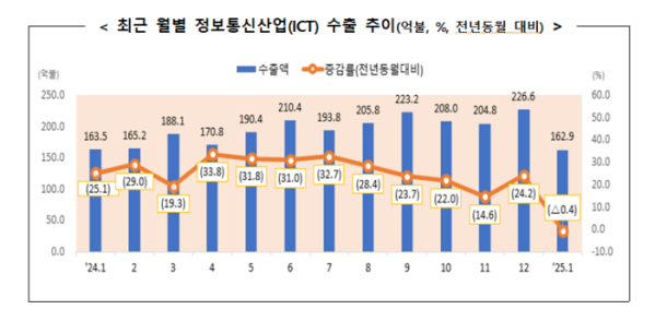 올해 1월 우리나라 정보통신기술(ICT) 산업 수출액은 162억9000만 달러로 잠정 집계됐다. 수출액은 장기 설 연휴에 따른 조업일수 감소 영향으로 전년 동월 대비 0.4% 줄었다. 그러나 인공지능(AI) 발 반도체 수요가 급등하며 반도체 수출은 15개월 연속 증가했다.
