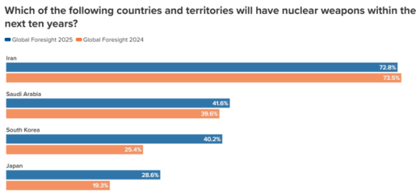 가장 눈에 띄는 것은 한국 핵무장이다. 응답자 40.2%는 한국이 10년 안에 핵무장을 할 것으로 내다봤다. 수치는 1년 전 25.4%에서 크게 뛰었다. 이 기간 일본의 경우 19.3%에서 28.6%로, 이란은 73.5%에서 72.8%로 바뀌었다. 1년 전 0%의 응답률이었던 대만과 우크라이나는 지정학적 위험을 이유로 각각 7.9%, 14.9%로 올랐다.