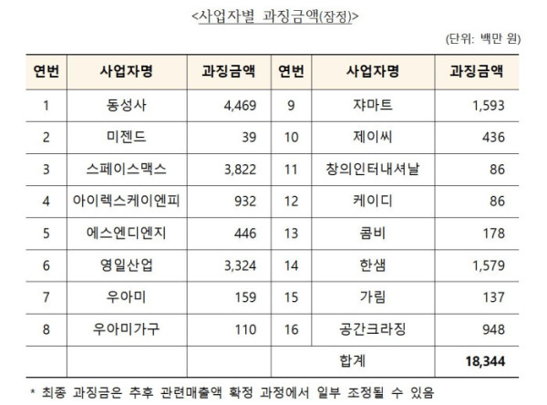 13일 공정위는 넥시스디자인그룹, 넵스 등 20개 가구업체의 독점규제 및 공정거래에 관한 법률 위반 행위에 대해 시정 명령과 과징금 총 183억 원(잠정)을 부과한다고 밝혔다. 이 중 동성사, 스페이스맥스, 쟈마트, 한샘 등 4개사는 고발하기로 했다. 해당 사건에 대한 가담 정도, 공정위 조사 협조 여부 등을 종합적으로 고려한 결과다.