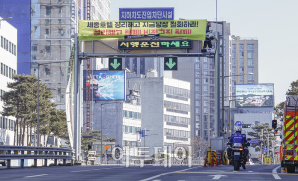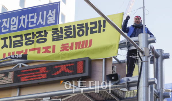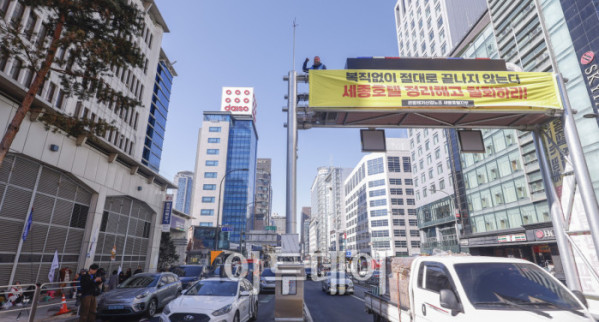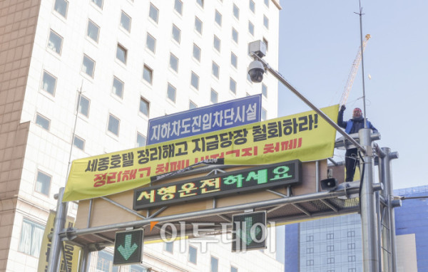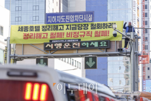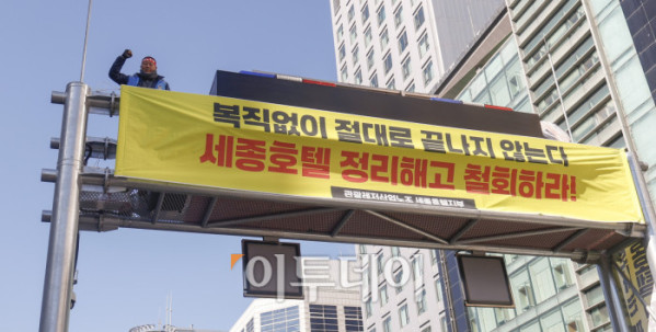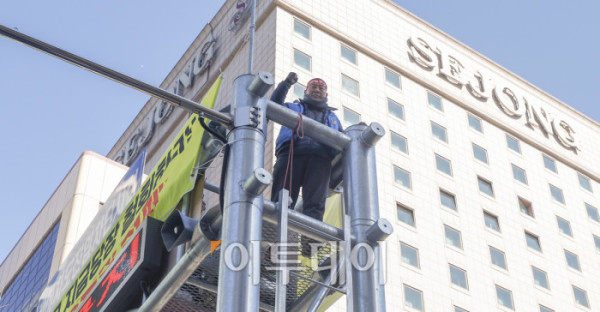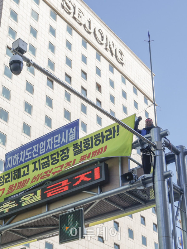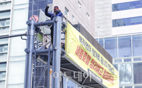 ▲13일 서울 중구 세종호텔 앞 지하차도 입구 교통시설 구조물에서 세종호텔 해고노동자인 고진수 씨가 구조물에 올라 정리해고 철회와 해고자 복직을 요구하며 고공농성을 벌이고 있다. 고 씨는 이날 새벽 호텔 앞 도로 구조물에 기습적으로 올라 농성을 시작했다. 조현호 기자 hyunho@
