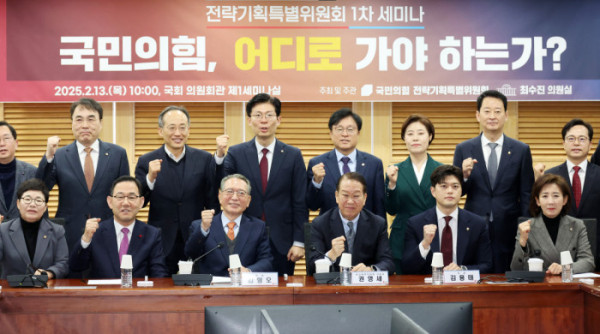 ▲13일 오전 서울 여의도 국회 의원회관에서 열린 국민의힘 전략기획특위 1차 세미나 '국민의힘, 어디로 가야 하는가?'에서 권영세(앞줄 오른쪽 세 번째부터) 비상대책위원장, 김형오 전 국회의장, 주호영 국회부의장 등 참석자들이 기념촬영을 하고 있다. 2025.02.13. (뉴시스)
