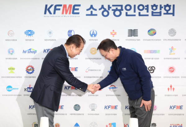 ▲권영세(왼쪽) 국민의힘 비상대책위원장과 송치영 소상공인연합회장 등이 13일 서울 여의도 소상공인연합회에서 열린 ‘국민의힘 경제활력민생특별위원회-소상공인연합회 간담회’에 앞서 인사하고 있다. 신태현 기자 holjjak@