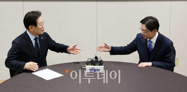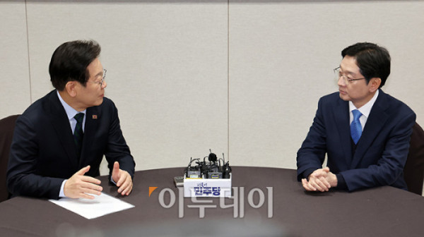 ▲이재명(왼쪽) 더불어민주당 대표와 김경수 전 경남지사가 13일 서울 여의도 국회에서 회동을 하고 있다. 고이란 기자 photoeran@