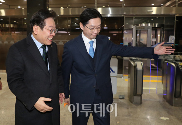 ▲이재명(왼쪽) 더불어민주당 대표와 김경수 전 경남지사가 13일 서울 여의도 국회에서 회동을 위해 이동하고 있다. 고이란 기자 photoeran@