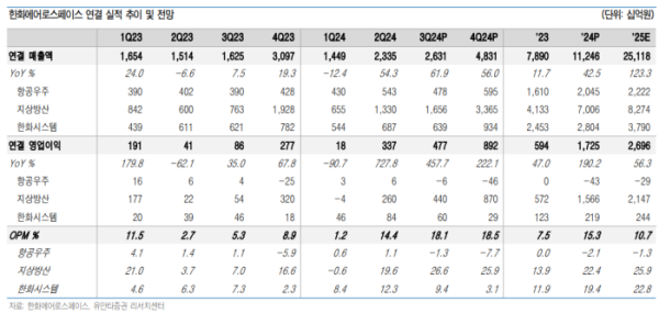 이 연구원은 “올해 매출액은 25조1000억 원, 영업이익 2조7000억 원으로 전망한다”며 “한화오션과 한화시스템의 필리 조선소 연결 편입이 반영됐다”고 했다.