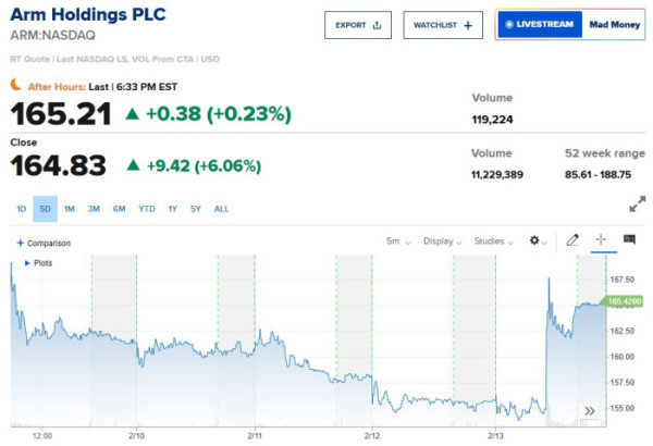 이날 뉴욕증시에서 반도체 설계업체 ARM은 전장 대비 6.06% 상승한 164.83달러에 거래를 마쳤다. 영국 파이낸셜타임스(FT)가 올해 자체 개발 칩을 출시할 계획이라고 보도가 호재로 작용했다. 소식통에 따르면 ARM은 이르면 올해 여름 자체 생산 첫 칩을 공개할 수 있을 것으로 전망되며, 페이스북 모회사 메타를 잠재 고객사로 확보한 것으로 전해진다. 메타가 입도선매를 한 것이다.