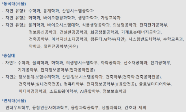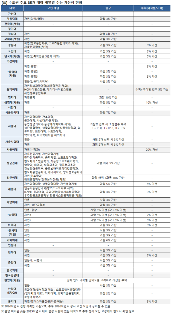 2025학년도 대비 세부 변동 사항이 있는 대학도 있다. 가령 경희대와 서울과기대는 인문계열 지원자의 사회탐구 영역 가산점을 2026학년도부터 폐지한다. 서울시립대는 자연계열 지원 시 과학탐구 영역에서 2과목을 모두 선택해야만 가산점을 부여하는 조건은 동일하지만, 가산점 규모를 7%에서 3%로 축소했다.