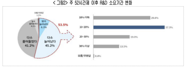 조사 대상 기업의 53.5%는 주 52시간 제도로 ‘연구개발 소요 기간이 늘었다’고 봤다. ‘줄었다’는 응답 비율은 45.4%, ‘모른다’는 1.1%였다. 기간이 얼마나 늘었는지에 대한 질문에는 69.8%가 ‘10% 이상’이라고 답했다.