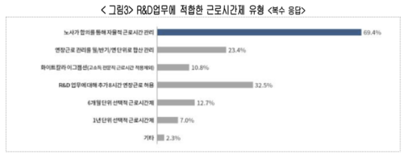 기업들은 ‘노사가 합의를 통해 자율적 근로시간 관리’(69.4%·복수응답)를 가장 적합한 근로시간제로 평가했다. ‘연구개발 업무에 대해 추가 8시간 연장근로 허용’(32.5%), ‘연장근로 관리를 월·분기·반기·연 단위로 합산 관리’(23.4%), ‘6개월 단위 선택적 근로시간제’(12.7%), ‘고소득 전문직 대상 근로시간 적용제외 방식의 화이트칼라 이그젬션’(10.8%) 등도 제시됐다.