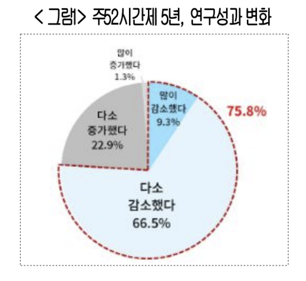 기업 연구부서의 75.8%가 주 52시간 제도 시행으로 인해 연구개발(R&D) 성과가 줄었다고 응답했다. 연구개발 분야에서만이라도 노사 자율 합의에 따라 근로 시간을 유연하게 조절해야 한다는 목소리가 나온다.