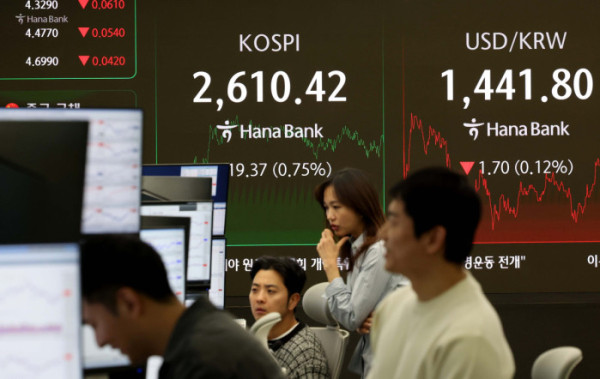 코스피가 3개월 반 만에 2610선을 돌파한 17일 서울 중구 하나은행 딜링룸 모니터에 코스피 종가가 표시되고 있다. 이날 코스피는 전 거래일 대비 19.37포인트(0.75%) 오른 2610.42에 거래를 마쳤다. 코스피 지수가 종가 기준 2610선을 넘어선 것은 지난해 10월 29일(2617.80) 이후 약 3개월 반 만이다.
