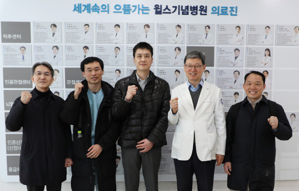 ▲윌스기념병원 박춘근 이사장(오른쪽 두번째)과 존스홉킨스병원 관계자들이 기념사진을 촬영하고 있다. (윌스기념병원)