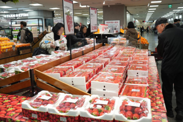 ▲서울 송파구 롯데마트 제타플렉스 잠실점에딸기 코너에서 고객들이 상품을 살펴보고 있다. (사진제공=롯데쇼핑)