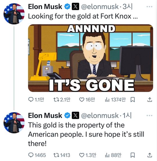 도널드 트럼프 미국 행정부에서 정부효율부(DOGE)를 이끄는 일론 머스크 테슬라 최고경영자(CEO)가 이번에는 정부의 금 보유고에 대한 조사 방침을 시사했다.