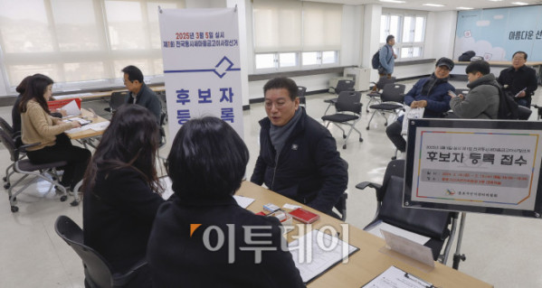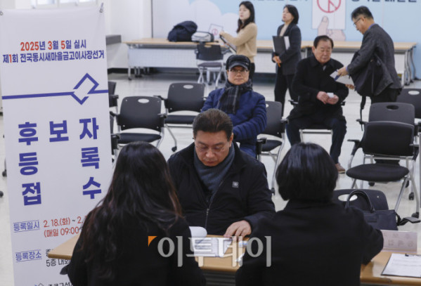 ▲제1회 전국동시새마을금고이사장선거 후보자 등록이 시작된 18일 서울 종로구 종로구선거관리위원회 후보자등록 접수처에서 후보자들이 후보자 등록을 하고 있다. 서울시 선거관리위원회는 이날부터 19일까지 접수를 받고, 선거는 3월 5일에 진행된다. 조현호 기자 hyunho@