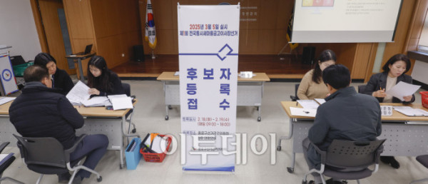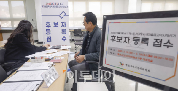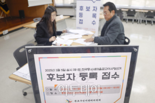 ▲제1회 전국동시새마을금고이사장선거 후보자 등록이 시작된 18일 서울 종로구 종로구선거관리위원회 후보자등록 접수처에서 한 후보자가 후보자 등록을 하고 있다. 서울시 선거관리위원회는 이날부터 19일까지 접수를 받고, 선거는 3월 5일에 진행된다. 조현호 기자 hyunho@