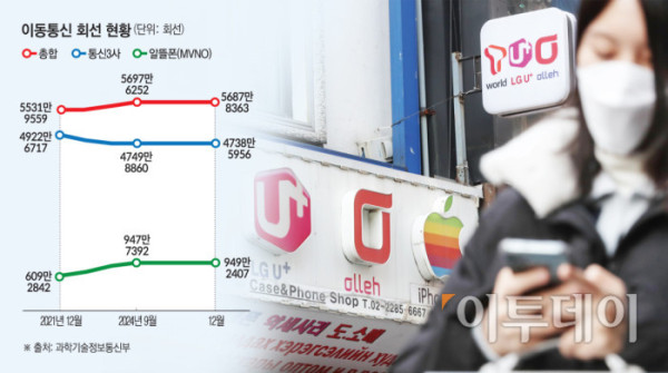 통신3사와 알뜰폰을 합한 이동통신 휴대폰 회선은 △10월 5696만5545 회선 △11월 5695만7096 회선 △12월 5687만8363 회선으로 지난해 4분기 내내 꾸준히 내리막을 걸었다. 전체 통신 회선이 3개월 내내 감소폭을 그린 건 이례적이다.