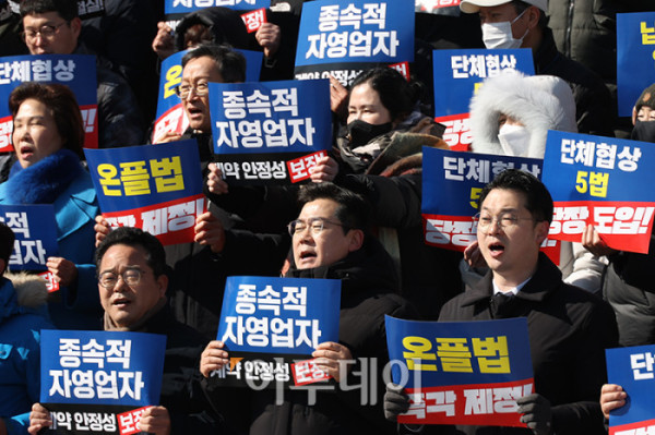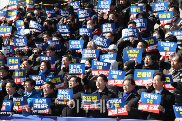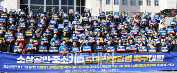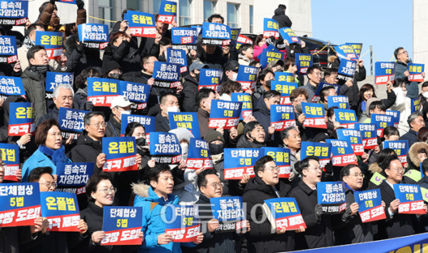 ▲18일 서울 여의도 국회 본청 앞 계단에서 열린 소상공인·중소기업 5대 민생입법 촉구대회에서 박찬대 더불어민주당 원내대표를 비롯한 참석자들이 피켓을 들고 구호를 외치고 있다. 고이란 기자 photoeran@