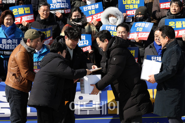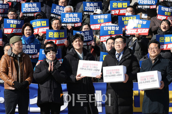 ▲18일 서울 여의도 국회 본청 앞 계단에서 열린 소상공인·중소기업 5대 민생입법 촉구대회에서 박찬대(오른쪽 두번째) 더불어민주당 원내대표가 온라인 플랫폼법 제정 촉구 시민 6018명 서명부를 전달받고 있다. 고이란 기자 photoeran@