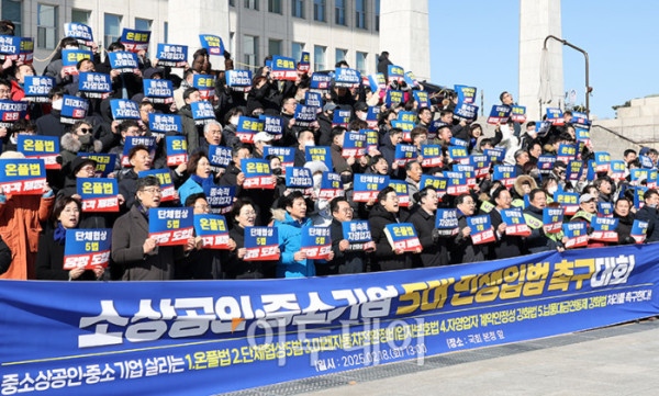 ▲18일 서울 여의도 국회 본청 앞 계단에서 열린 소상공인·중소기업 5대 민생입법 촉구대회에서 박찬대(앞줄 가운데) 더불어민주당 원내대표를 비롯한 참석자들이 피켓을 들고 구호를 외치고 있다. 고이란 기자 photoeran@