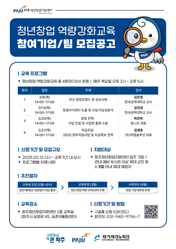 교육은 2025년 3월 6일부터 3월 27일까지 매주 목요일 오후 2시~5시, 총 4회차 과정으로 진행되며, 장소는 파주청년창업지원센터 2층 교육실이다.