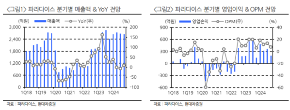 김현용 현대차증권 연구원은 "파라다이스의 4분기 매출액은 전년 대비 9.9% 증가한 2658억 원, 영업이익은 32.1% 늘어난 195억 원으로, 컨센서스 이익을 대폭 하회했다"라며 "매출은 카지노가 전년 대비 14.8% 증가했음에도 기타 사업 성장률이 둔화하며 성장 폭이 줄었고, 매출 증가에 따른 레버리지 효과 및 비용 효율화 기조 지속으로 영업이익은 전년 대비로는 개선됐다"라고 전했다.