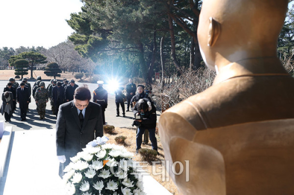 ▲우원식 국회의장이 19일 경북 포항시 해병대 제1사단 본부에 방문해 고 채수근 상병 흉상에 추모 및 헌화를 하고 있다. 국회사진취재단