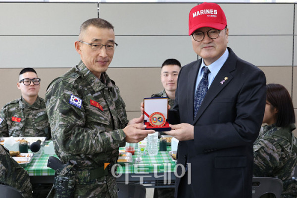 ▲우원식 국회의장이 19일 경북 포항시 해병대 제1사단 본부에 방문해 기념품을 전달 받고 있다. 국회사진취재단