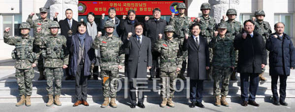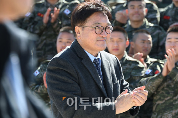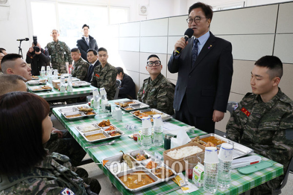 ▲우원식 국회의장이 19일 경북 포항시 해병대 제1사단 본부에 방문해 장병들을 격려하고 있다. 국회사진취재단