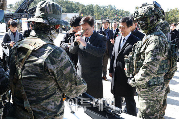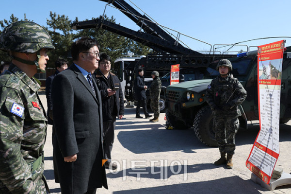 ▲우원식 국회의장이 19일 경북 포항시 해병대 제1사단 본부에 방문해 해병대 주요장비를 견학하고 있다.국회사진취재단