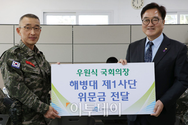 ▲우원식 국회의장이 19일 경북 포항시 해병대 제1사단 본부에 방문해 위문금을 전달하고 있다. 국회사진취재단