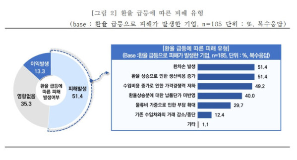 피해 유형(복수응답)은 △환차손 발생(51.4%) △고환율로 인한 생산비용 증가(51.4%) △수입 비용 증가로 인한 가격경쟁력 저하(49.2%) △환율상승분에 대한 납품단가 미반영(40.0%) 등이다.