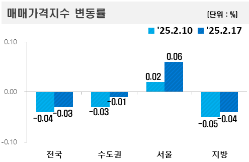 전국 기준 아파트값 변동률은 지난주보다 소폭 오른 –0.03%로 집계됐다. 지방은 지난주보다 0.01%p 오른 –0.04%로 기록됐다.