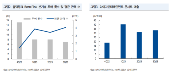 NH투자증권은 와이지엔터테인먼트에 대해 “블랙핑크 투어 일정 일부가 공개된 가운데, 중국 공연 재개 가능성까지 제기되면서 실적 및 모멘텀 양쪽에 대한 기대감이 높아지고 있다”면서 “신인 베이비몬스터의 수익화 구간 진입 또한 긍정 요인”이라고 했다.