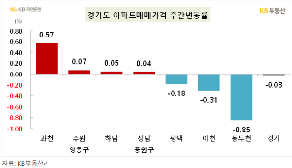 21일 KB부동산 통계 분석 결과 이번 주(17일 기준) 경기 아파트 매맷값 변동률은 과천이 0.57% 상승한 것으로 집계됐다. 이는 이번 주 서울에서 가장 큰 폭의 상승률을 기록한 강남구(0.38%)와 송파구(0.29%)보다 높은 수준이다.