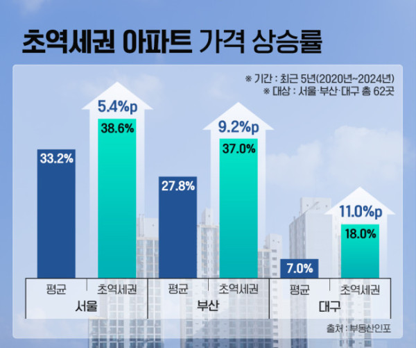 21일 부동산 시장 분석업체 부동산인포에 따르면 최근 5년(2020년~2024년)간 44개의 서울 초역세권 단지 평균 집값이 38.6% 올랐다. 서울 전체 아파트 평균 매매가격 상승률(33.2%)에 비하면 5.4%포인트(p) 더 높다. 여기에서 초역세권은 아파트와 지하철역이 접해 있거나 출입구로 바로 이동이 가능한 단지를 의미한다.