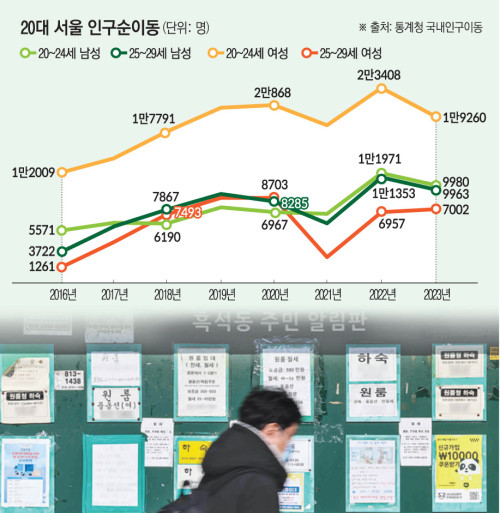 이는 청년층의 수도권 쏠림을 유발한다. 본지가 23일 통계청 ‘국내인구이동’ 마이크로데이터를 분석한 결과, 2004년까지 연간 5000명 안팎이었던 20대 남자의 서울 순유입은 2006년 1만 명, 2022년 2만 명을 넘어섰다. 20대 여자의 서울 순유입은 더 가파르게 늘었다. 20~24세는 2016년까지 1만 명 안팎을 유지했으나, 2019년 2만 명을 넘어서고, 2022년에는 2만3408명까지 치솟았다. 25~29세는 2007년까지 순유출을 기록하다가 2008년부터 2016년까지 소규모 증감을 반복했고, 2017년부터 급속도로 불어났다. 정점은 2019년 9424명이었다.