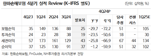 정준섭 NH투자증권 연구원은 "보험계약마진(CSM) 잔액 감소에 따른 상각이익 축소와 자동차보험 업황 악화를 반영해 이익 추정치를 조정했다"고 말했다.