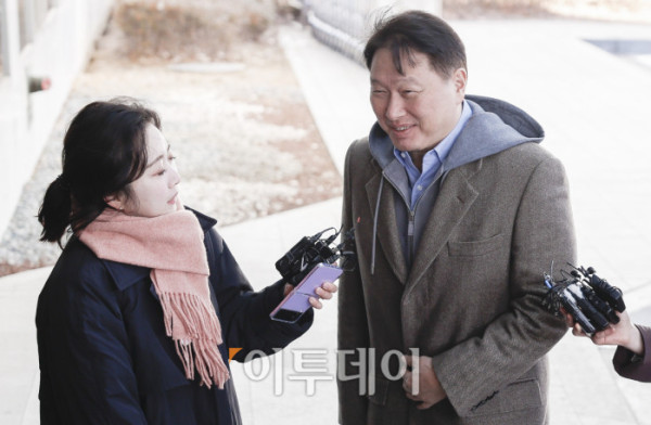 ▲최태원 대한상공회의소 회장이 19일 서울 강서구 서울김포비즈니스항공센터(SGBAC)를 통해 미국 워싱턴 D.C로 출국하며 취재진의 질의에 답변하고 있다. 조현호 기자 hyunho@