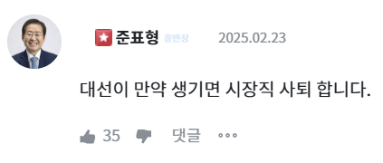 홍 시장은 자신의 온라인 소통 채널인 ‘청년의 꿈’ 청문홍답(청년의 고민에 홍준표가 답하다)에서 한 지지자가 ‘시장직 유지해달라. 조기 대선이든 정상 대선이든 시장직에 계셔야 좋다고 본다. 당원들 표 얻는 데도 더 좋고 여러 가지 면에서 효과적이라고 본다’는 게시글에 “대선(상황이)이 만약 생기면 시장직 사퇴합니다”라며 “내가 집권하면 TK 현안은 모두 해결된다”고 답했다.