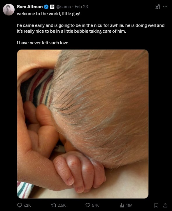 올트먼 CEO는 전날 엑스(X·옛 트위터)에 “세상에 온 것을 환영해. 작은 친구야”라는 글과 함께 신생아의 손이 어른의 손가락을 잡은 사진을 게재했다. 이어 “아기가 일찍 태어나서 당분간 신생아 중환자실(NICU)에 있어야 하지만 잘 지내고 있다”면서 “이 작은 버블(외부 세계와 단절된 채 오로지 아기와 함께하는 작은 세계를 비유적으로 표현) 안에 있는 것이 정말 좋다. 이렇게 큰 사랑을 느껴본 적이 없다”고 밝혔다.